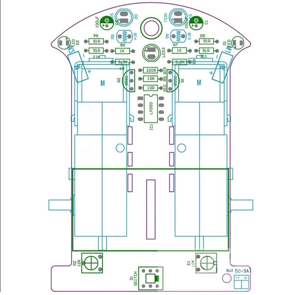 The LM393 comparator in conjunction with two photosensitive resistors enables rapid and sensitive control in an intelligent tracking car. This system detects imbalances, such as pressure on a black runway, immediately stopping one side of the motor while accelerating the other, correcting the car’s direction and ensuring precise navigation. To simplify this complex principle, assembly begins with a digital circuit for the intelligent tracking car, allowing users to gradually become familiar with mechanical and electronic principles including photocells, voltage comparators, and motor drive circuits.