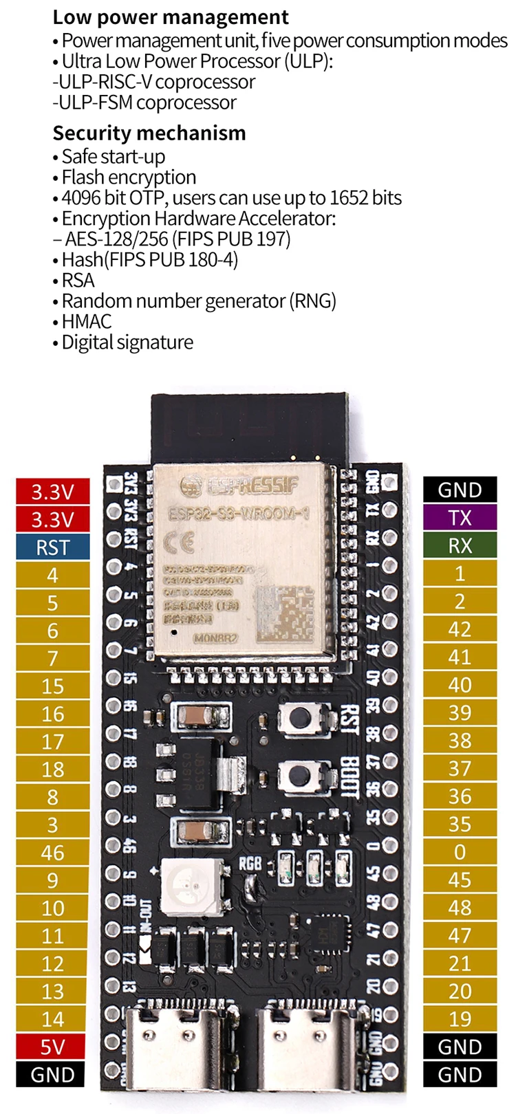 4. ESP32-S3 chip provides rich peripheral interfaces and has a variety of unique hardware security mechanisms.